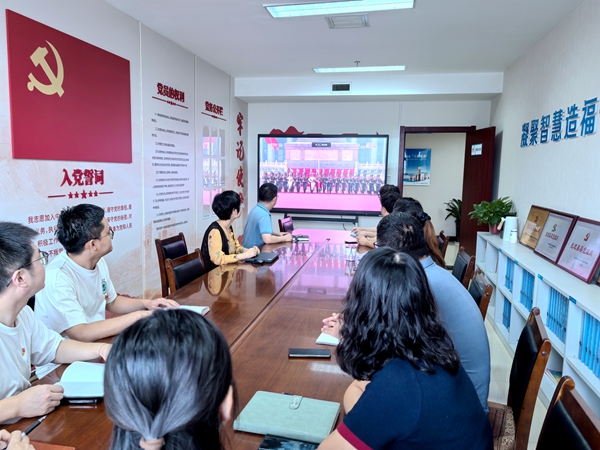 活动第一项,全体党员观看了纪念中国人民抗日战争暨世界反法西斯战争胜利80周年阅兵仪式直播,聆听习近平总书记重要讲话,学习伟大抗战精神。屏幕上,受阅方阵如钢铁洪流步伐铿锵,官兵将士们的口号中,是人民军队有决心、有办法、有能力捍卫国家主权和领土完整的钢铁誓言。受阅武器装备全部为国产现役主战装备,众多新型装备首次亮相,一声“打击范围覆盖全球”,展现祖国现代化国防成果,尽显大国底气。