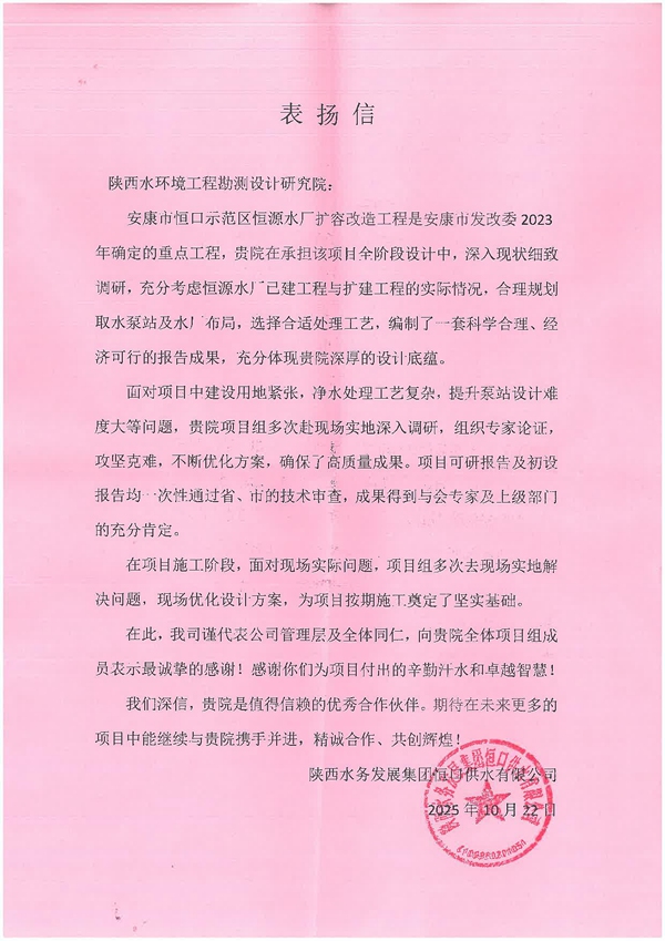 近日,我院收到来自陕西水务发展集团恒口供水有限公司的表扬信,对我院负责的安康市恒口示范区恒源水厂扩容改造工程全阶段设计工作,给予高度认可与诚挚感谢,并充分肯定了我院在项目推进中的专业能力与责任担当。