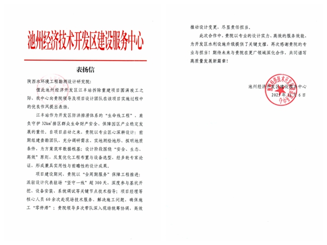 近日,池州经济开发区江丰站拆除重建项目顺利竣工。池州经济开发区建设服务中心特向我院发来表扬信,对项目组在工程查勘、设计及建设全流程中展现的优良作风与高效服务,给予高度认可和诚挚表扬。
