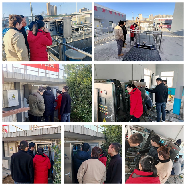 在项目现场,专业组沿污水处理工艺流程展开系统性学习,依次参观了污水处理厂主要建筑物;重点观摩了污水处理核心工艺;系统了解了曝气系统、污泥回流系统等重要机电设备的运行机理。针对项目数字化建设特点,深入机房、泵房等区域,实地研讨网络机柜、变频控制柜、现地控制柜及PLC控制系统的集成运行情况,通过“设备讲解-原理分析-数据验证”的三步学习模式,掌握了自控设备与网络设备的协同控制逻辑。结合项目施工内容,现场开展了plc及触摸屏程序调试,感受理论设计和实际操作之间的紧密联系;同时还协助处理了现场紧急情况,在实践中深化了对异常工况处置流程的理解。