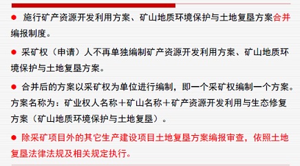 矿山地质环境三方案具体为:1)矿产资源开发利用方案,2)矿山地质环境保护与治理恢复方案,3)土地复垦方案,从2019年9月已要求矿山企业三方案合并编制、审批。
