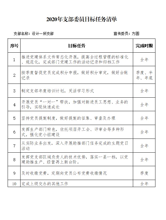 2020年设计一所支部委员目标任务清单(方圆)