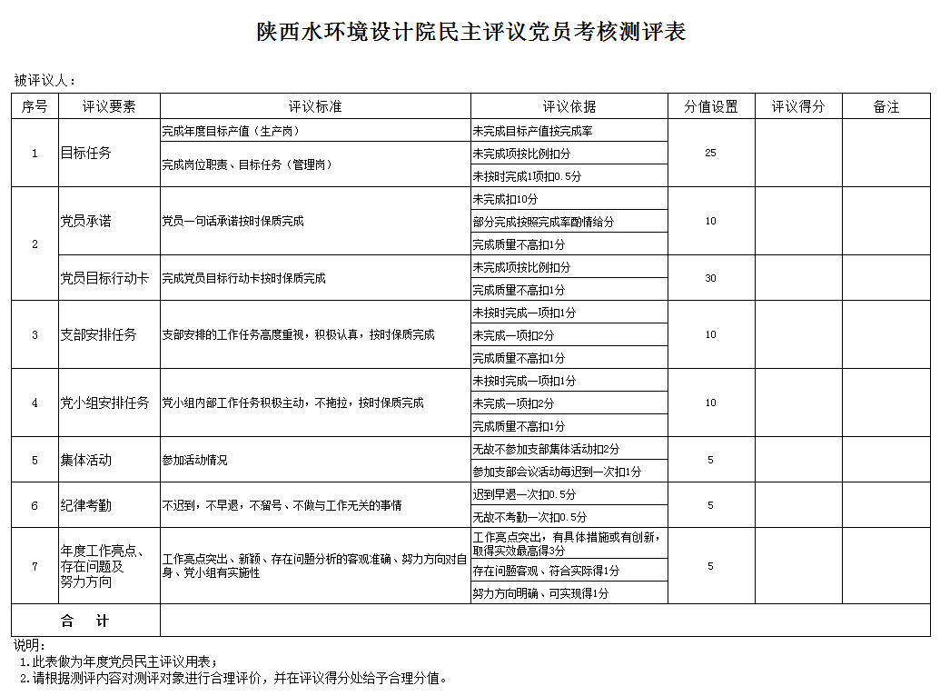 陕西水环境设计院民主评议党员考核测评表
