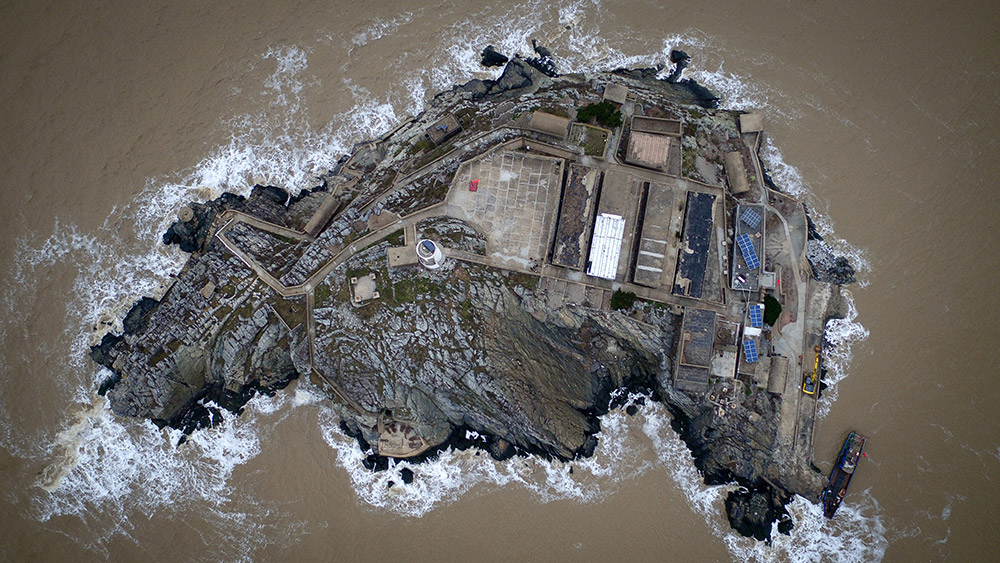 王继才夫妇在开山岛的最东边举行向国旗敬礼仪式
