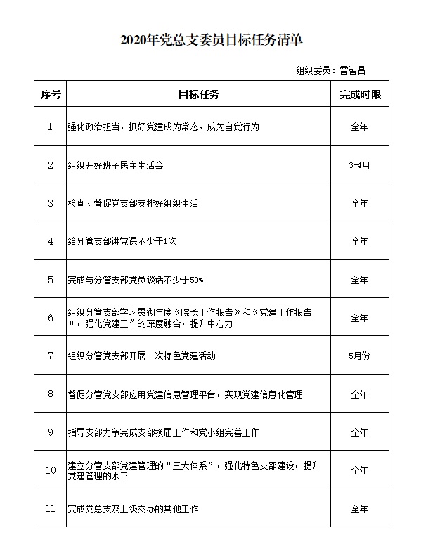 2020年总支委员目标任务清单(雷智昌)