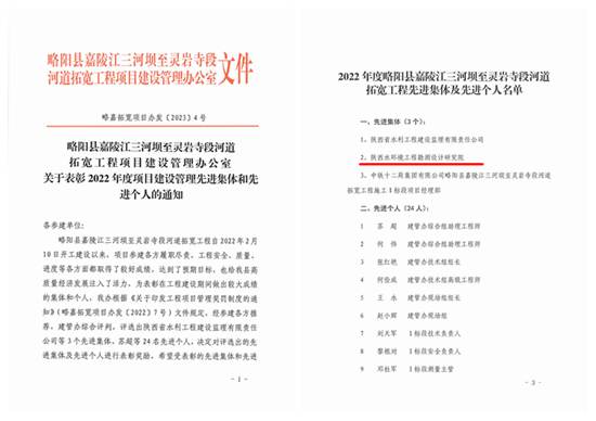 近日,略阳县嘉陵江三河坝至灵岩寺段河道拓宽工程项目建设管理办公室发布《关于表彰2022年度项目建设管理先进集团和先进个人的通知》,水环境设计院作为设计单位获先进集体荣誉,孙淑侠、宋华坤获先进个人表彰。