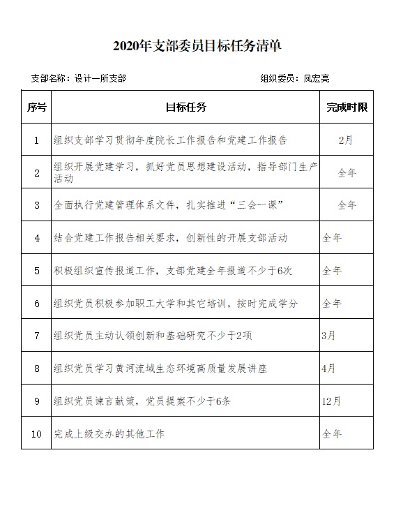 2020年设计一所支部委员目标任务清单(凤宏亮)