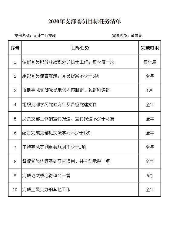 2020年设计二所支部委员目标任务清单(薛晨亮)