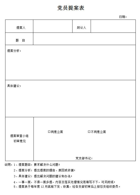 党员在提案征集通知下达10个工作日内,在充分调查研究、确定议案内容的基础上,填写党员提案表提交党小组长。