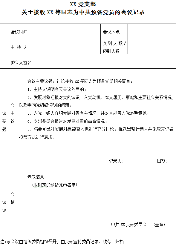 附件:支部关于接收XX等同志为预备党员的会议记录