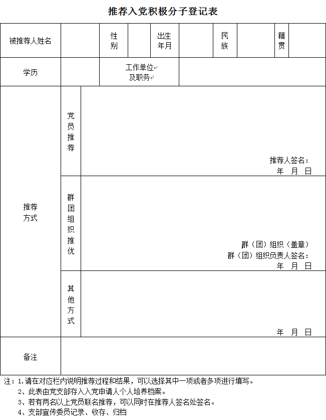 推荐入党积极分子登记表