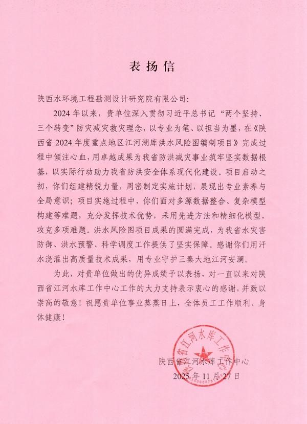 11月27日,陕水环院有限公司收到来自陕西省江河水库工作中心的表扬信,信中对公司项目团队在《陕西省 2024 年度重点地区江河湖库洪水风险图编制项目》中的卓越表现给予高度肯定,对公司为全省防洪减灾事业作出的贡献致以崇高敬意。