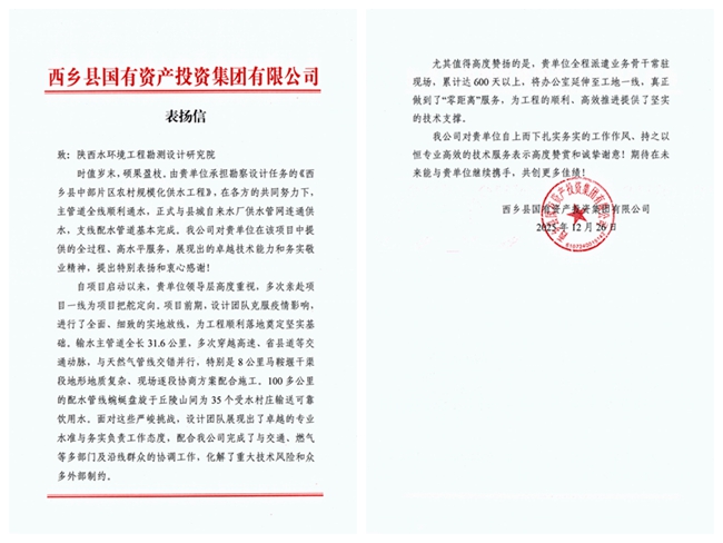12月26日,我公司收到西乡县国有资产投资集团有限公司发来的表扬信,信中对我公司承担的《西乡县中部片区农村规模化供水工程》勘察设计工作给予高度评价,对项目团队展现的专业素养和敬业精神致以诚挚谢意。