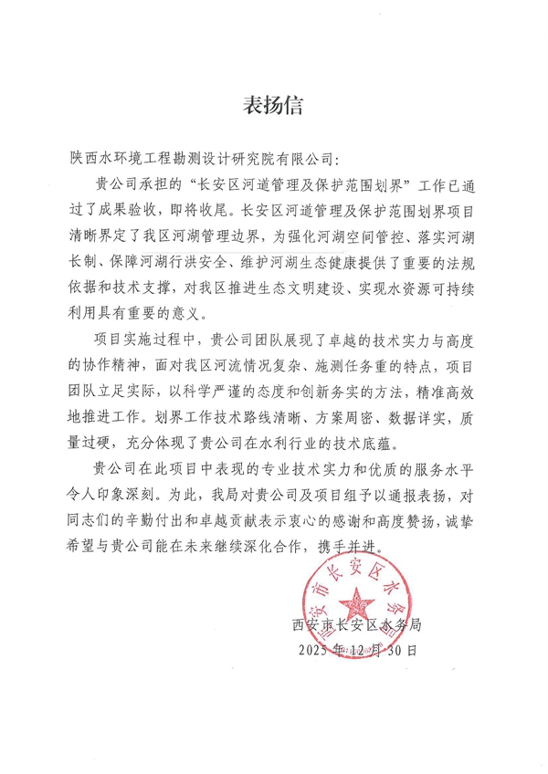 近日,我公司收到西安市长安区水务局发来的表扬信,信中对公司承担的“长安区河道管理及保护范围划界”项目成果给予高度评价。